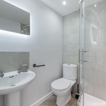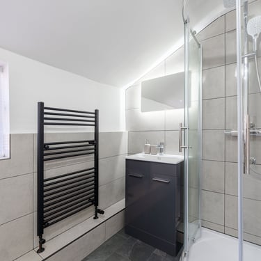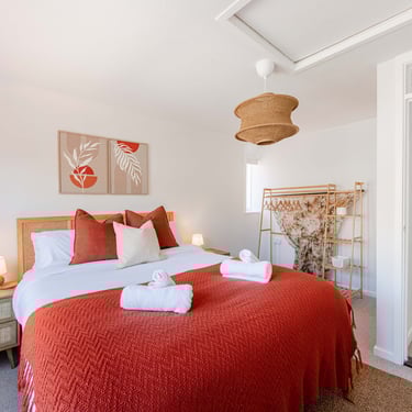 The master bedroom features a king-sized bed and a stunning en-suite with sleek, modern finishes. A second bedroom also boasts a king-sized bed, while the third bedroom offers two double beds—ideal for larger groups or families. A newly installed family bathroom includes a contemporary shower enclosure, bathtub, and a separate WC, ensuring both luxury and practicality.